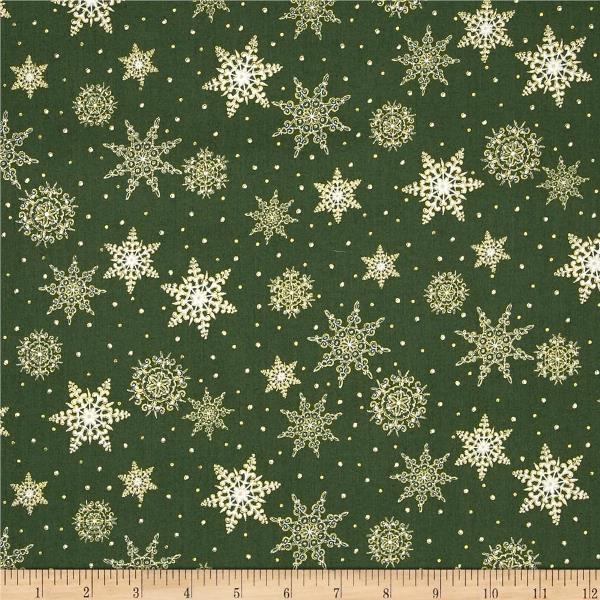Jolly Old St Nick, Metallic Snowflakes Green Fabric.