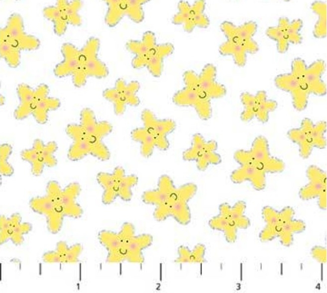 Northcott Mermaid Wishes Happy Glitter Starfish on White Fabric.
